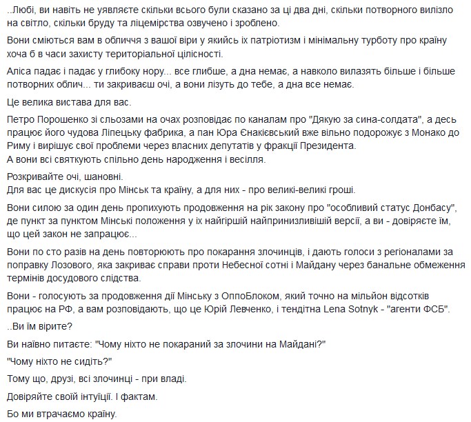 "Теперь понимаю, для чего в парламенте депутаты из Енакиево. Только утром увидел, что фразу "Олег, вынеси козла" жена генпрокурора Ирина Луценко в Раде кричала нардепу Олегу Недаве. На исконно русском языке", пишет у себя в Facebook журналист из Горловки Александр Билинский.