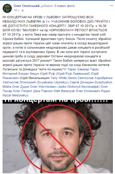 "Всех неравнодушных львовян приглашаем прийти и не допустить концерта Сергея Бабкина", – написал он.