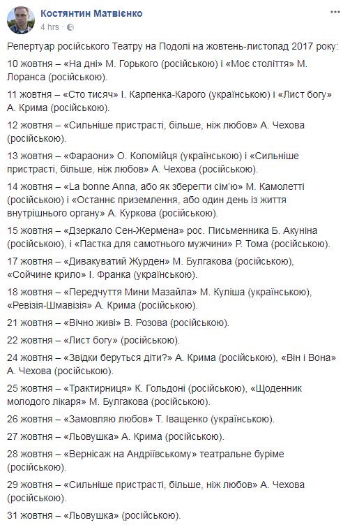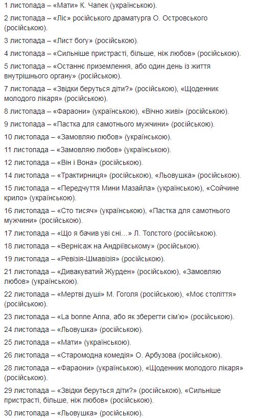 Так, из 26 октябрьских спектаклей, 21 пройдет на русском языке, и лишь пять - на украинском - это комедия Карпенко-Карого "Сто тысяч", "Фараоны" Алексея Коломийца, лирическая драма "Сойкино крыло" Ивана Франка, комедия "Предчувствие Мины Мазайло" Николая Кулиша и "Заказываю любовь" Татьяны Иащенко.