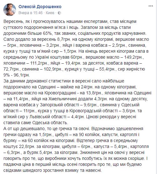 "Сало добавило за сентябрь 8,7 грн на одном килограмме, сливочное масло - 5 грн, говядина - 3,2 грн, яйца и вареная колбаса - 2,5 грн, свинина, курица в тушке и мягкий сыр - 1,5 грн. На конец сентября килограмм сала в среднем по Украине стоил 60 грн, сливочное масло - 149,2 грн, говядина - 111,2 грн, яйца - 19,4 грн за десяток, колбаса вареная - 72,7 грн, свинина - 102,9 грн, курица в тушке - 55,4 грн, сыр жирностью 9% - 96,1 грн", - написал Дорошенко.