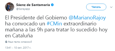 "Пучдемон сегодня погрузил Каталонию в пучину абсолютной неопределенности. Никто не может применять несуществующий закон, имплементировать итоги референдума, которого не было, и брать на себя ответственность за волеизъявление целого народа", – отметила вице-премьер.