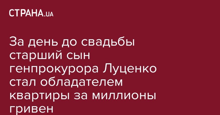 Старший сын генпрокурора Луценко - Александр стал обладателем элитной квартиры в Соломенском районе Киева. За день до своей свадьбы, 8 сентября 2017 года, на него были зарегистрированы 183,7 квадратных метра в новом жилом комплексе с видом на лес.