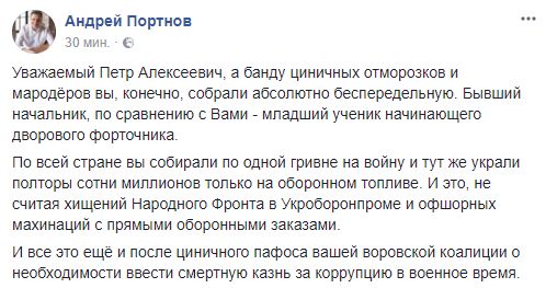 По всей стране вы собирали по одной гривне на войну и тут же украли полторы сотни миллионов только на оборонном топливе. И это не считая хищений Народного Фронта в Укроборонпроме и офшорных махинаций с прямыми оборонными заказами. И все это еще и после циничного пафоса вашей воровской коалиции о необходимости ввести смертную казнь за коррупцию в военное время".
