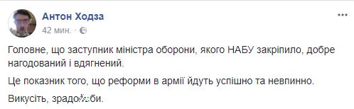 Антон Ходза: "Главное, что заместитель министра обороны, которого НАБУ закрепило, хорошо накормлен и одет. Это показатель того, что реформы в армии идут успешно и постоянно. Викусите, зрадо*бы".