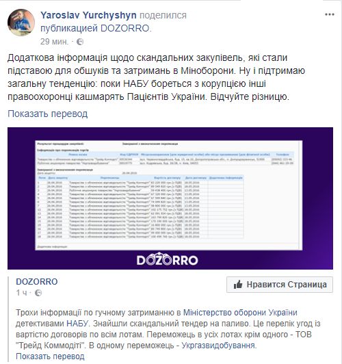 Ярослав Юрчишин делится информацией Dozorro и комментирует: "Дополнительная информация по скандальным закупкам сталп основанием для обысков и задержаний в Минобороны. Ну и поддержу общую тенденцию: пока НАБУ борется с коррупцией.ю другие правоохранители кошмарят Пациентов Украины. Почувствуйте разницу".