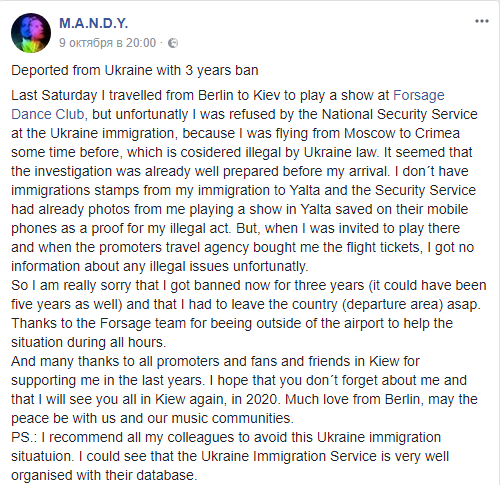 Участника известного немецкого проекта  M.A.N.D.Y. Патрика Бодмера выдворили из Украины и запретили ему въезд на три года из-за посещения аннексированного Крыма. Об этом сам музыкант рассказал в Facebook.