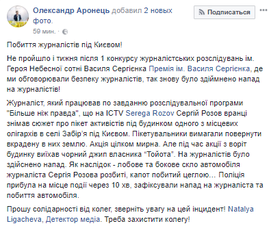 По данным активиста, журналист Сергей Розов вел съемку пикета дома одного из местных олигархов. Пикетчики требовали возвратить украденную у них землю. Акция, по словам Аронца, была мирной.