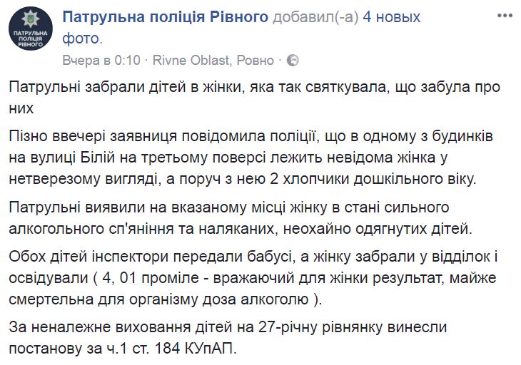 За ненадлежащее воспитание детей на 27-летнюю ровенча вынесли постановление по ч.1 ст.184 Кодекса Украины об административных правонарушениях.
