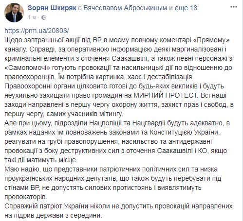 Об этом заявил советник главы МВД Зорян Шкиряк на своей странице в Facebook, ссылаясь на оперативные данные и комментируя завтрашний "майдан" с участием Саакашвили.
