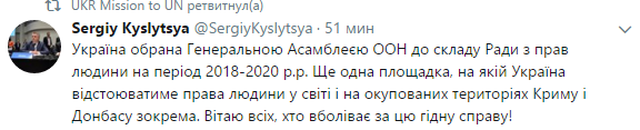 "177 голосами Украина избрана в состав Совета ООН по правам человека на 2018-2020 годы", - сказано в нем.