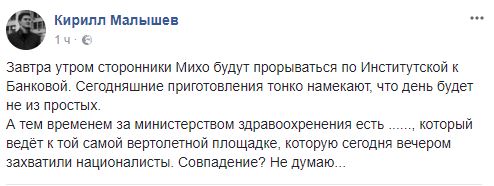 "Завтра утром сторонники Михо будут прорываться по Институтской к Банковой. Сегодняшние приготовления тонко намекают, что день будет не из простых (речь о Нацгвардии по периметру правительственного квартала - ред). А тем временем за министерством здравоохренения есть ......, который ведёт к той самой вертолетной площадке, которую сегодня вечером захватили националисты. Совпадение? Не думаю...", - пишет журналист в Facebook.