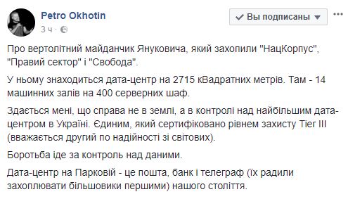 Дата-центр на Парковой - это почта, банк и телеграф (их советовали захватывать большевики первыми) нашего века", - пишет в Facebook политический эксперт Петро Охотин.