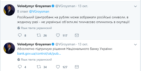 "Абсолютно поддерживаю решение Национального Банка Украины. Российский Центробанк в рублях может изображать российские символы, в любом случае - не украинские объекты, которые временно оказались в оккупации!", - написал Гройсман.