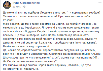 Так, народный депутат Ирина Геращенко заявила на своей странице в Facebook о неприятном разговоре с коллегой Сергеем Лещенко. Мол, нардеп подошел к ней и не сдерживая слов обвинил в постах в соцсетях, за которые "должно быть стыдно".