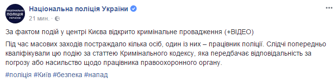 По факту нанесения телесных повреждений во время акции протеста в центре Киева 17 октября открыто уголовное производство. Об этом сообщает Нацполиция в Facebook.