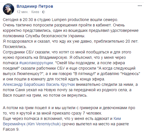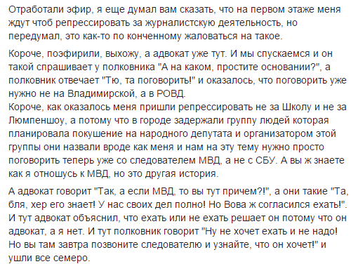 "Отработали эфир, я еще думал вам сказать, что на первом этаже меня ждут чтоб репрессировать за журналистскую деятельность, но передумал, это как-то по конченному жаловаться на такое. Короче, поэфирили, выхожу, а адвокат уже тут. И мы спускаемся и он такой спрашивает у полковника "А на каком, простите основании?", а полковник отвечает "Тю, та поговорить!" и оказалось, что поговорить уже нужно не на Владимирской, а в РОВД. Короче, как оказалось меня пришли репрессировать не за Школу и не за Люмпеншоу, а потому что в городе задержали группу людей которая планировала покушение на народного депутата и организатором этой группы они назвали вроде как меня и нам на эту тему нужно просто поговорить теперь уже со следователем МВД, а не с СБУ. А вы ж знаете как я отношусь к МВД, но это другая история", - написал Петров.
