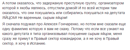 В конце концов, благодаря адвокату, оказалось, что и ехать никуда не надо. О причинах визита СБУ Петров сообщает следующее: "По всей истории там оказалось, что они покушались или собирались покушаться на депутата ЯЙЦОМ! Я сначала подумал про Алексея Гончаренко, но потом мне сказали еще одну фамилию которую я вам не скажу. Потому что если все узнают на какого депутата я типа организовывал покушение сырым яйцом, меня сразу же примут в Правый сектор командиром, а я не хочу в Правый сектор, я хочу в Испанию".
