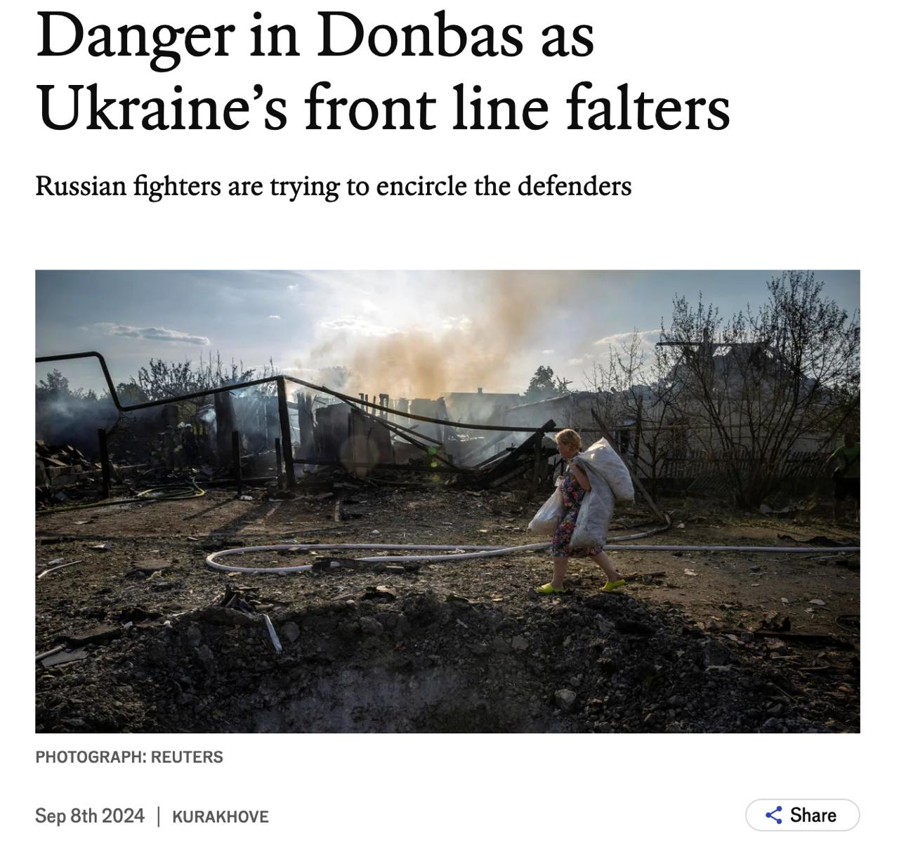 9.49 ВСУ на прошлой неделе удалось частично стабилизировать фронт под Покровском. При этом россияне развивают наступление на Курахово и угрожают там окружением, пишет The Economist со ссылкой на украинских военных.