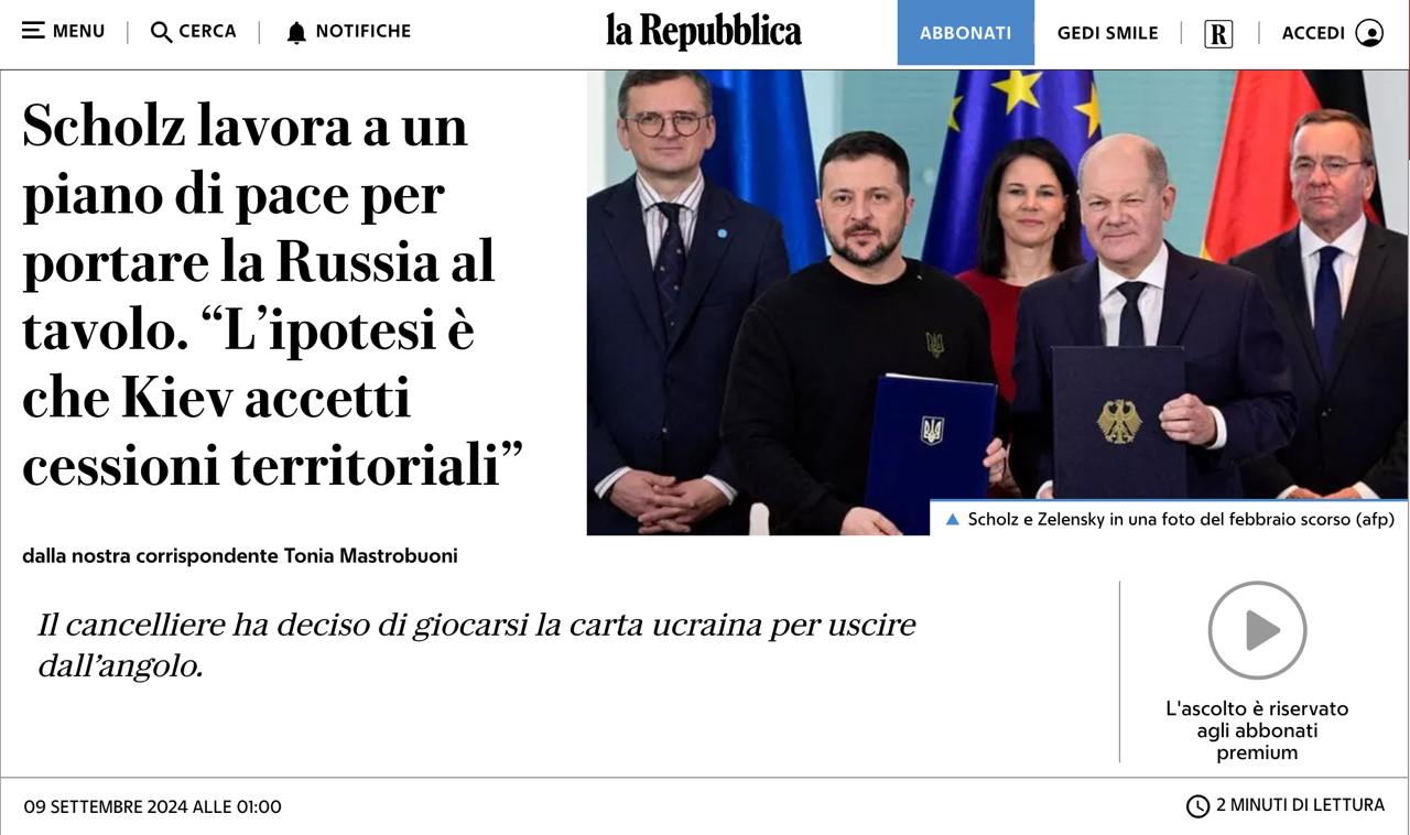 11.35 Канцлер Шольц готовит мирный план, который подразумевает сохранение за РФ захваченных украинских территорий, пишет итальянская газета La Repubblica.