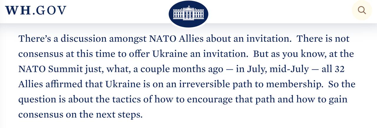 "Среди союзников по НАТО идет дискуссия о приглашении. На данный момент нет консенсуса относительно того, чтобы предложить Украине приглашение. Но, как вы знаете, на саммите НАТО в середине июля все 32 союзника подтвердили, что Украина находится на необратимом пути к членству. Поэтому вопрос в тактике того, как поощрять этот путь и как достичь консенсуса относительно следующих шагов", - заявил на брифинге представитель администрации Байдена.