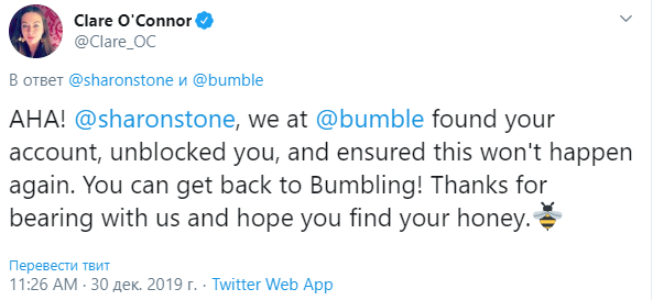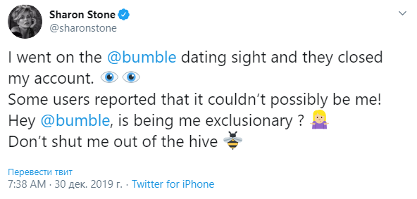 Стоун рассказала об инциденте на своей странице в Twitter. "Я зашла в сервис знакомств Bumble, но мой аккаунт заблокировали. Некоторые пользователи сообщили, что это не могла быть я. Эй, Bumble, я что, в изоляции?", - написала актриса.