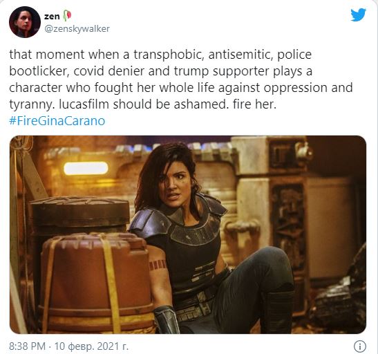 Пост вскоре был удален, но после него актрису начали травить в Твиттере. Там быстро набрал популярность хэштег #FireGinaCarano (Увольте Джину Карано).