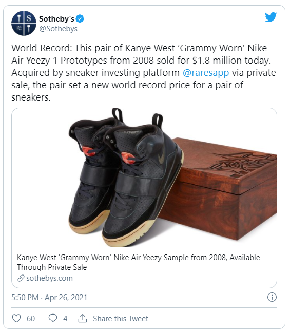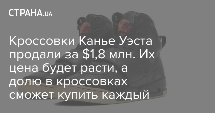Кроссовки Канье Уэста продали за $1,8 млн. Их цена будет расти, а долю в кроссовках сможет купить каждый