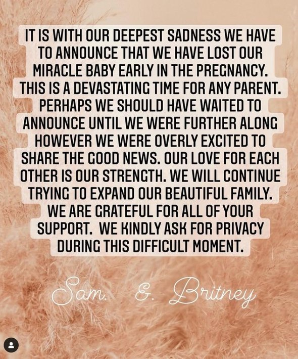 "С глубочайшим прискорбием мы вынуждены сообщить, что потеряли нашего чудо-ребенка на раннем сроке беременности. Это страшное время для любого родителя. Возможно, нам стоило немного подождать с объявлением новости о беременности, но мы были так взволнованы, что хотели поскорее поделиться чем-то хорошим. Наша любовь друг к другу — наша сила. Мы продолжим попытки расширить нашу прекрасную семью. Мы благодарим за огромную поддержку и просим дать нам время побыть наедине в этот сложный период", — говорится в совместном посте Бритни и ее жениха Сэма Асгари.