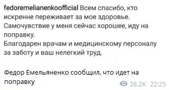 "Всем спасибо, кто искренне переживает за мое здоровье. Самочувствие у меня сейчас хорошее, иду на поправку. Благодарен врачам и медицинскому персоналу за заботу и ваш нелегкий труд", - написал боец в своем Instagram.