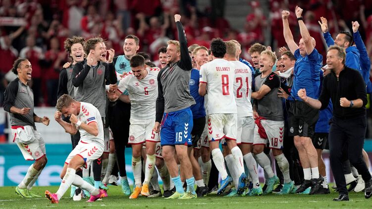 Радость футболистов сборной Дании, которые вышли в плей-офф Евро 2020, фото: Twitter/Euro2020