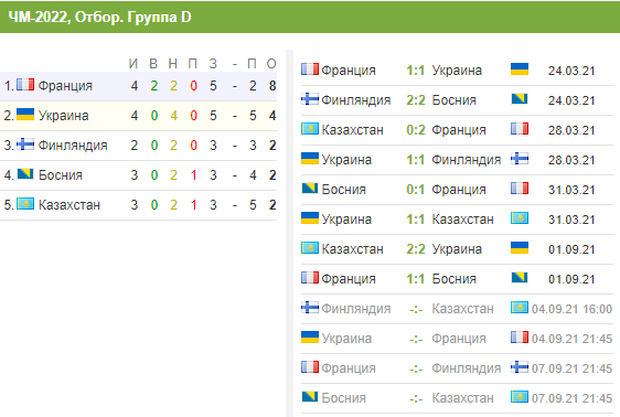 В другом матче группы D Финляндия сыграет с Казахстаном, и в этом матче для сборной Украины лучшим исходом будет ничья. Впрочем, если сегодня подопечные Александра Петракова уступят французам, наши шансы попасть в Катар-2022 из малореальных и вовсе станут призрачными.