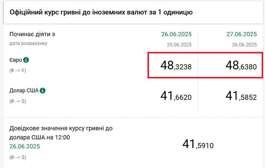 Національний банк України встановив на завтра, 27 червня новий курс гривні до євро, піднявши його з 48,3238 грн/€ до 48,6380 грн/€. Це максимальне значення за історію.
