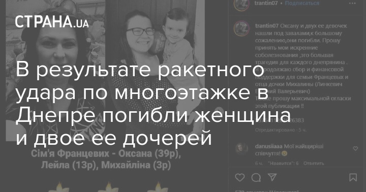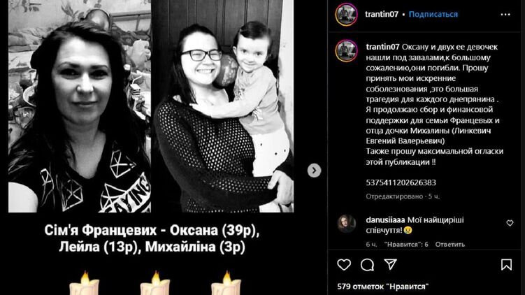 "Оксану та двох її дівчаток знайшли під завалами, на жаль, вони загинули. Це велика трагедія для кожного дніпрянина", - повідомили родичі загиблої.