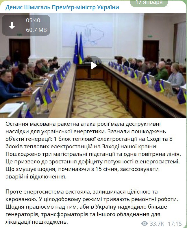 "Зазнали пошкоджень об'єкти генерації: один блок теплової електростанції на сході та вісім блоків теплових електростанцій на заході нашої країни. Пошкоджено три магістральні підстанції та одна повітряна лінія. Це призвело до зростання дефіциту потужності в енергосистемі. Що змушує щодня, починаючи з 15 січня, застосовувати аварійні відключення", – повідомив прем'єр.
