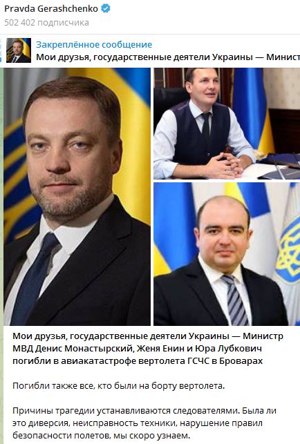 "Причини трагедії встановлюються слідчими. Чи це була диверсія, несправність техніки, порушення правил безпеки польотів, ми скоро дізнаємося", - заявив він у своєму телеграм-каналі.