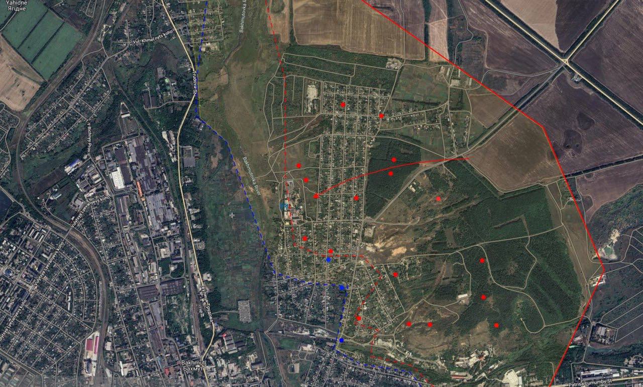 Судячи з опублікованої ним карти, "вагнерівці" знаходяться в мікрорайоні Східний і на північ від нього (їх передбачувані позиції позначені на карті червоними крапками).