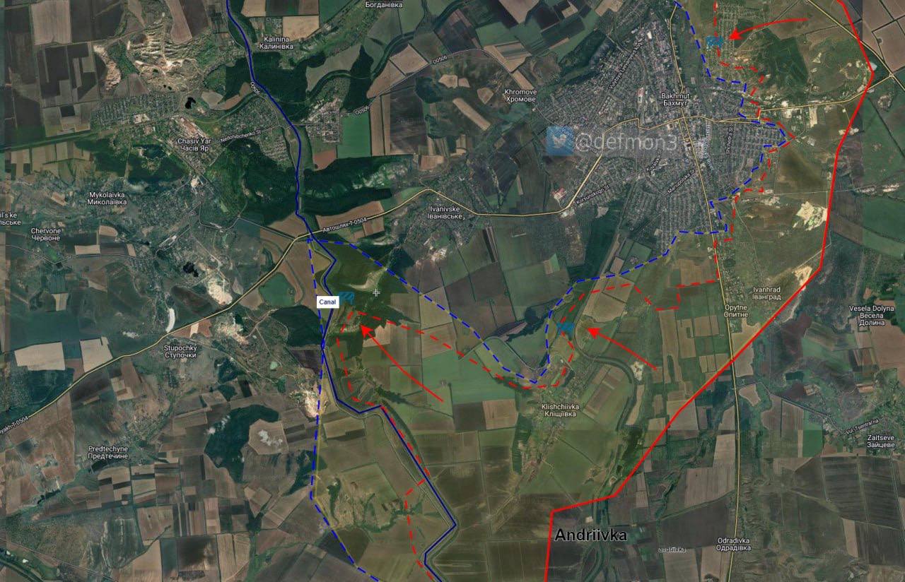 Судячи з карти, росіяни підійшли до водного каналу, який перетинає цю трасу в районі розв'язки. Це менше двох кілометрів від дороги на Годинник Яр.