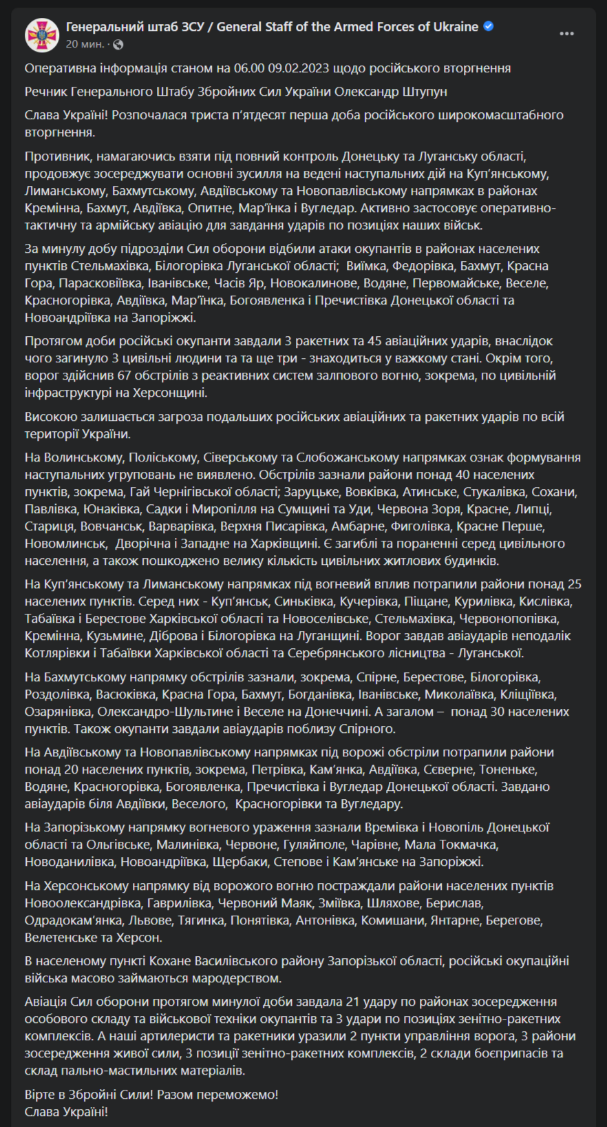 06:59 Зведення Генштабу ЗСУ на ранок 9 лютого. Головне: