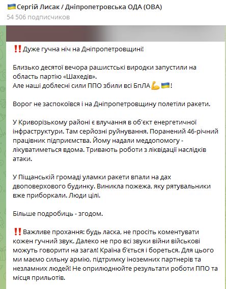 При цьому у Криворізькому районі було влучення в об'єкт енергетичної інфраструктури. Там серйозні руйнування. Поранено 46-річного працівника підприємства. Йому надали медичну допомогу.