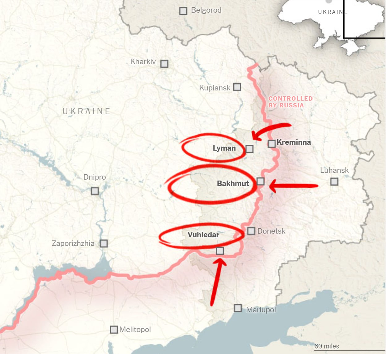 Росіяни сподіваються здобути символічну перемогу, вигнавши українців із Бахмута. Також вони прагнуть убезпечити лінії постачання, які матимуть вирішальне значення для будь-якого успіху в Україні.