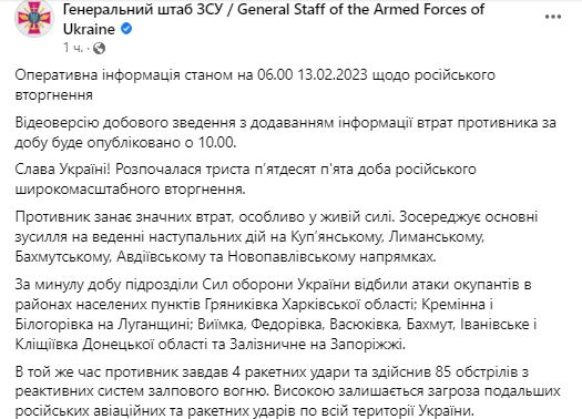 07.20 Зведення Генштабу на ранок 13 лютого. Головне з неї:
