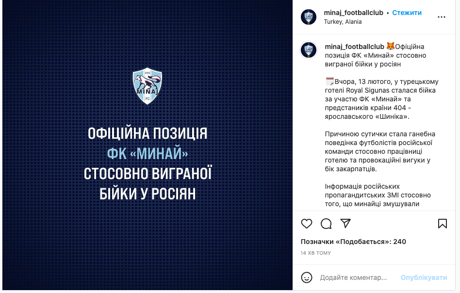 Пізніше з'явився і офіційний коментар "Мінаю". Футбольний клуб також наполягає, що конфлікт спровокували росіяни своєю неналежною поведінкою.