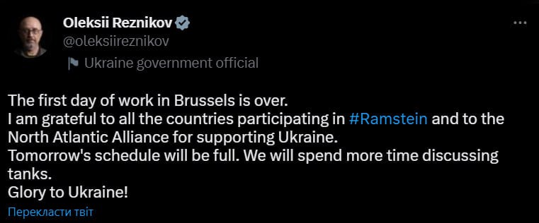 "Перший робочий день у Брюсселі завершено. Я вдячний усім країнам-учасницям Ramstein та Північноатлантичному альянсу за підтримку України. Завтра розклад буде заповнений. Ми витратимо більше часу на обговорення танків", - написав він у Twitter.
