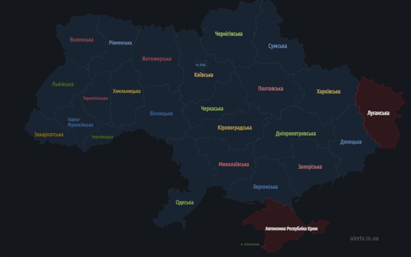 22:40 Повітряна тривога вже на всьому південному сході країни. Пізніше додалася Харківська область.