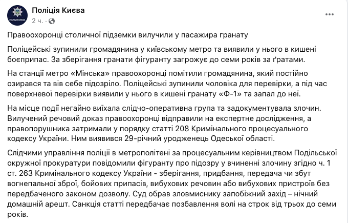 На станції київського метро "Мінська" поліцейські вилучили у пасажира гранату Ф-1. Чоловіка відправили під нічний домашній арешт - тобто вдень він зможе й надалі перебувати на вулиці.