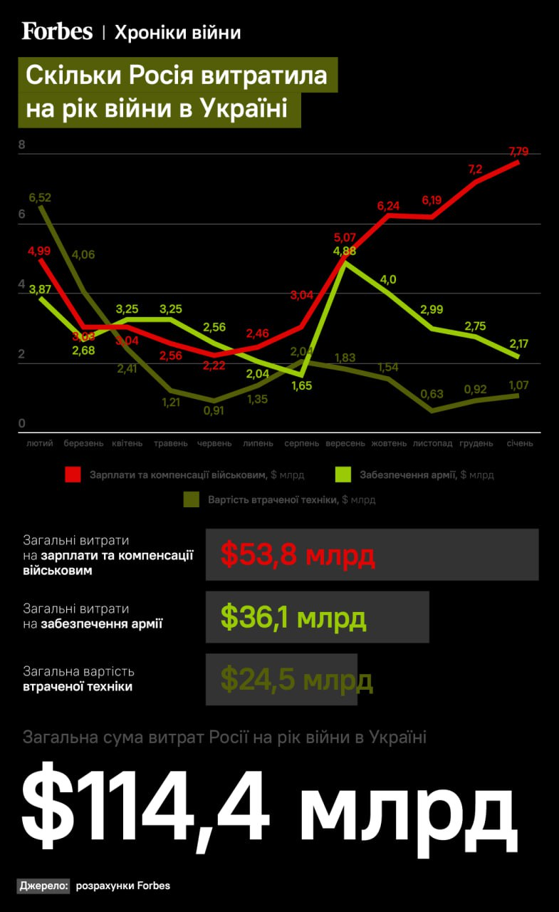 Росія витратила на війну $114,4 млрд. за рік (близько $10 млрд. на місяць). Це третина всіх доходів російського бюджету за 2021 рік.
