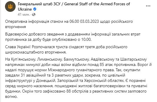 Зведення Генштабу ЗСУ станом на 18:00 3 березня 2023 року