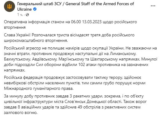 У понеділок, 13 березня, Генштаб ЗСУ оприлюднив зведення про ситуацію на фронті.
