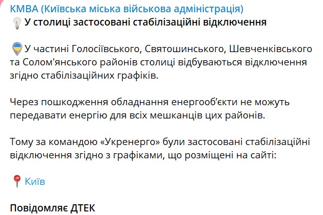 У Києві після атаки у деяких районах не було світла, води та тепла. Позавчора подачу відновили, проте вчора у чотирьох районах столиці запровадили стабілізаційні відключення, пізніше – і на Київщині.