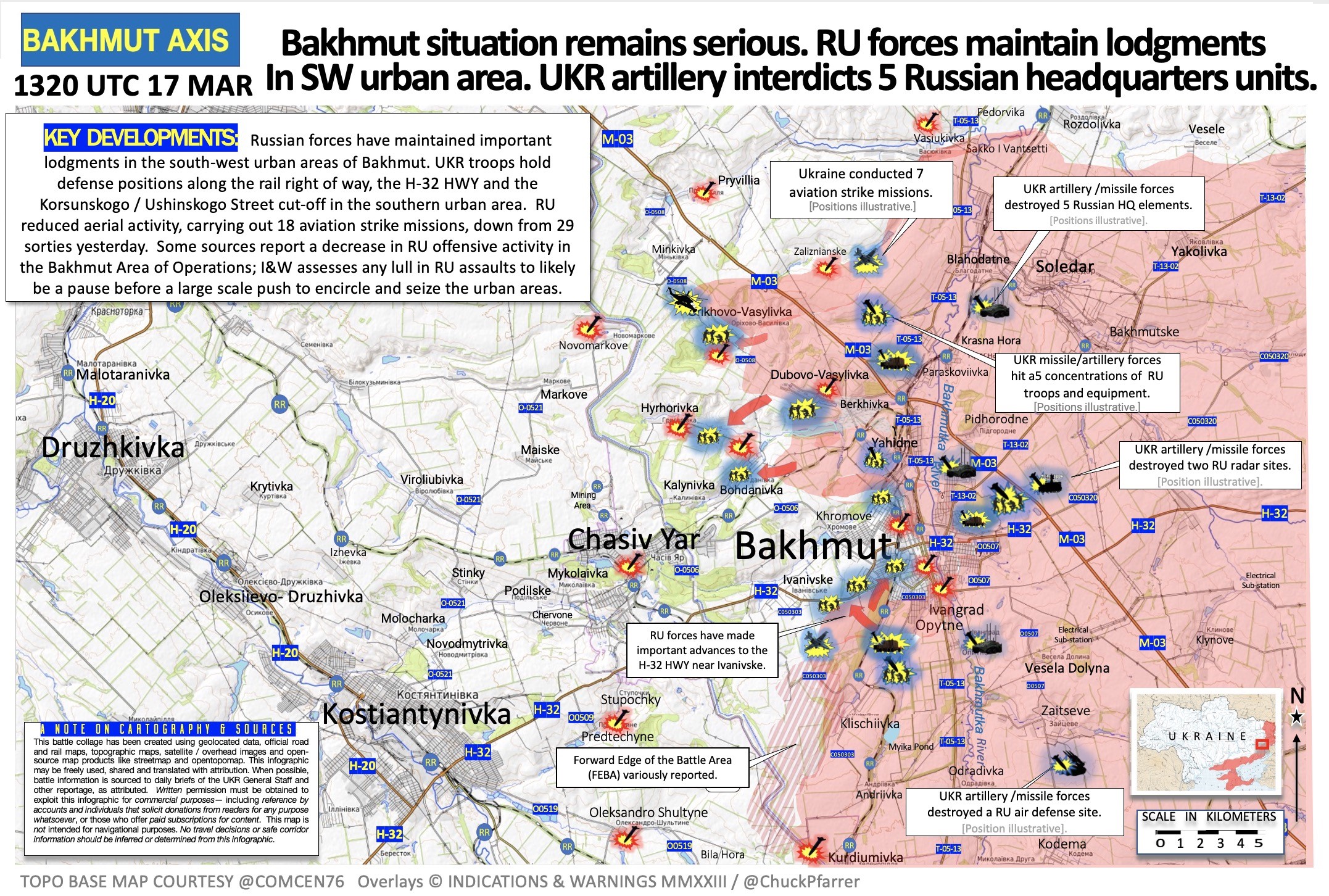 "Інститут вивчення війни" (США) пише, що російські війська просунулися до Північного водосховища (на південь від Ягідного у бік Хромово). Також в Інституті підтверджують заяву Пригожина про те, що 15 березня "вагнерівці" захопили Залізянське на північний захід від Бахмута.